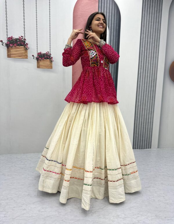 PRODUCT DETAILS : CholiFabric:- Bandhej PrintWork:- Gamathi and Real Mirror Work Inner:- Micro CottonCups:- Yes   (Fully Stitched) LehengaFabric:- Khadi Cotton Inner:-