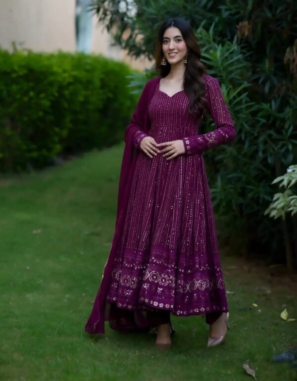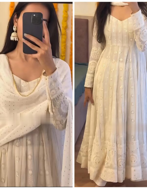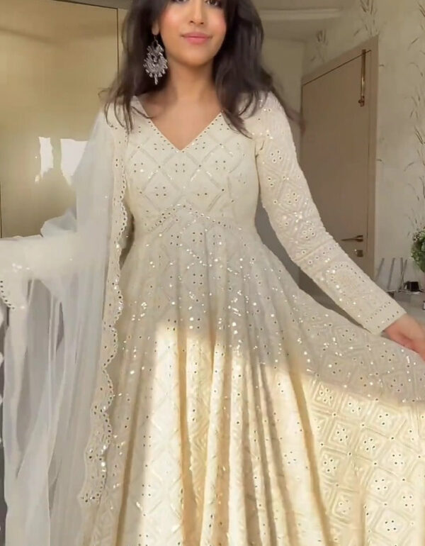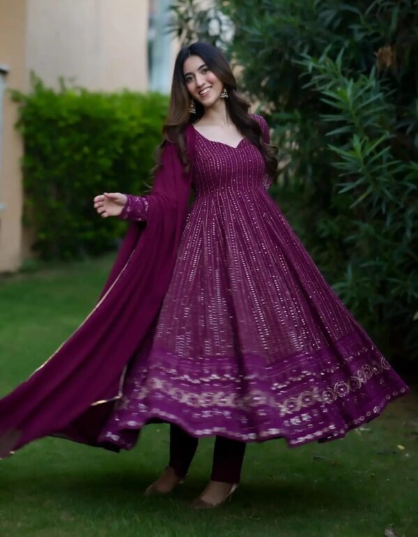 Model Height: 5.5 Model Is Wearing : M Size Gown :Fabric – Georgette Work – Sequence Design WorkFlair : 4.50mtrHeight –