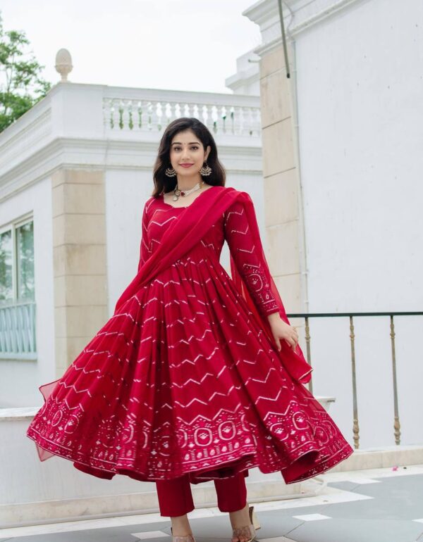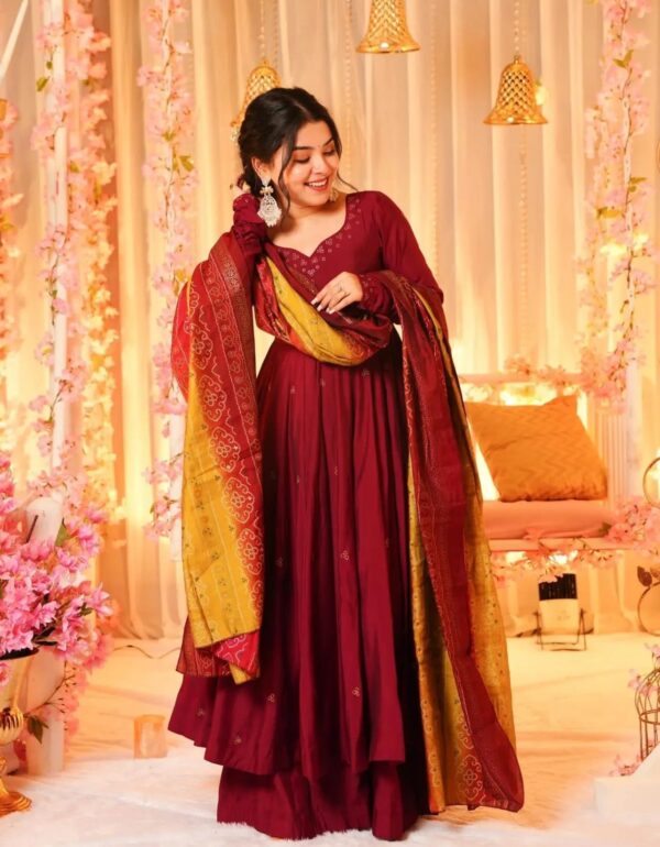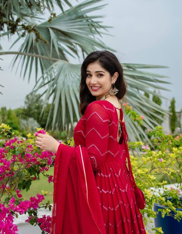 Model Height: 5.5 Model Is Wearing : M Size Gown :Fabric – Georgette Work – Embroidery Sequence Design WorkFlair – 4.50mtrHeight