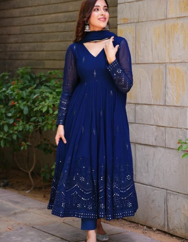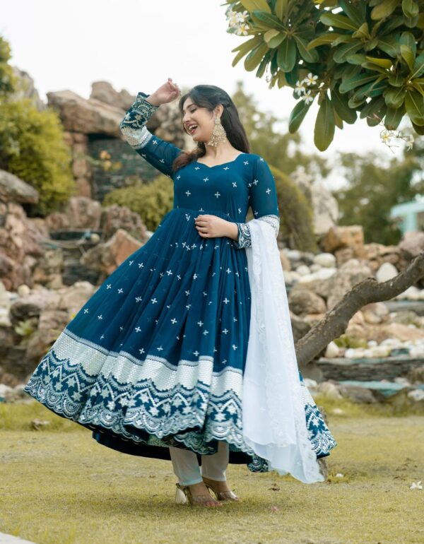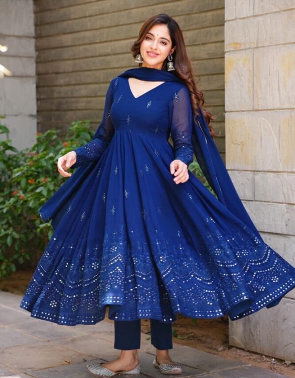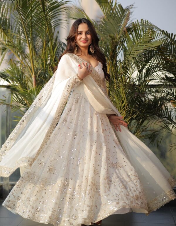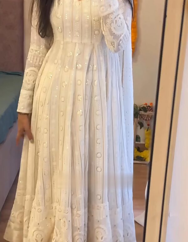Model Height: 5.5 Model Is Wearing : M Size Gown :Fabric – Georgette Work – Embroidery Sequence Design WorkFlair : 4.50mtrHeight
