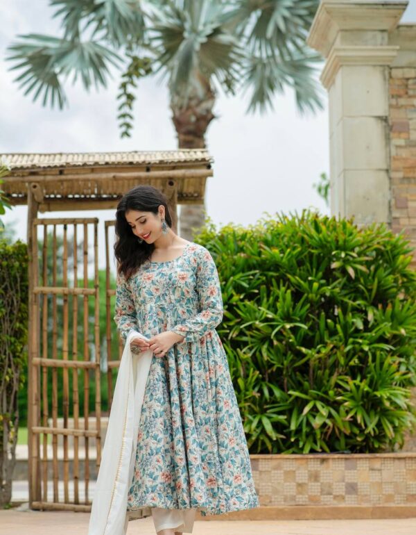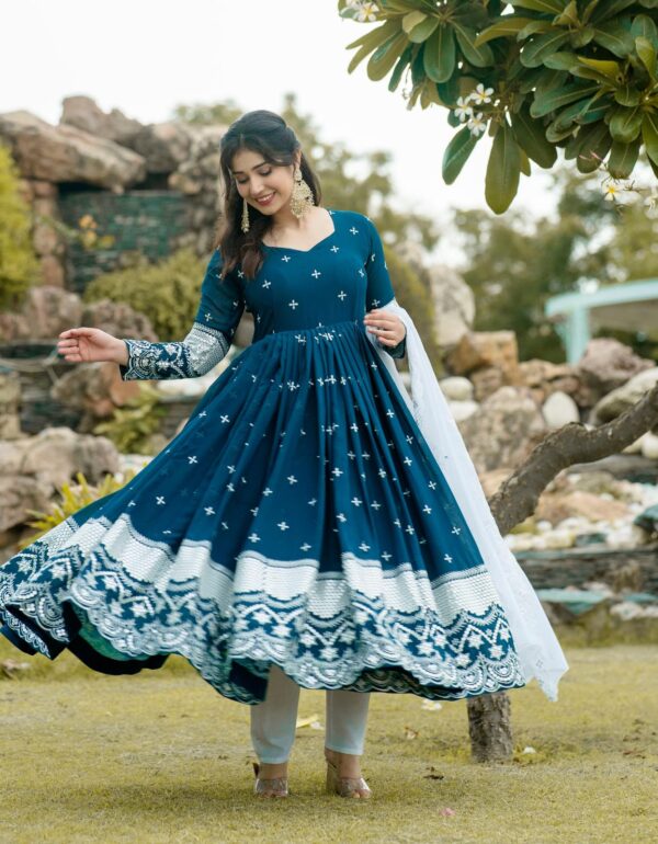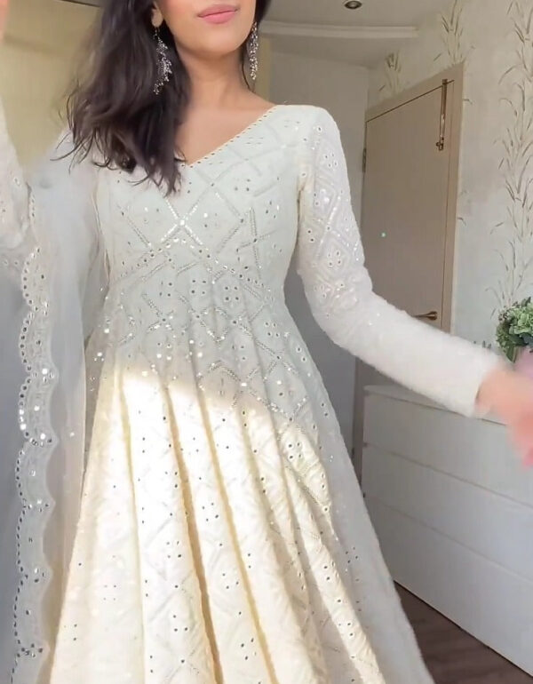 Model Height: 5.5 Model Is Wearing : M Size Gown :Fabric – MuslinWork – Embroidery Sequence Design WorkFlair : 4.50mtrHeight