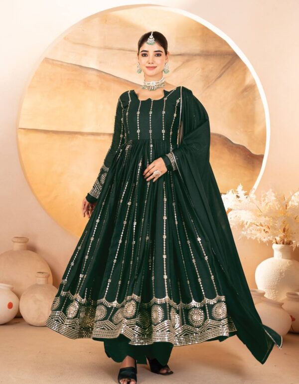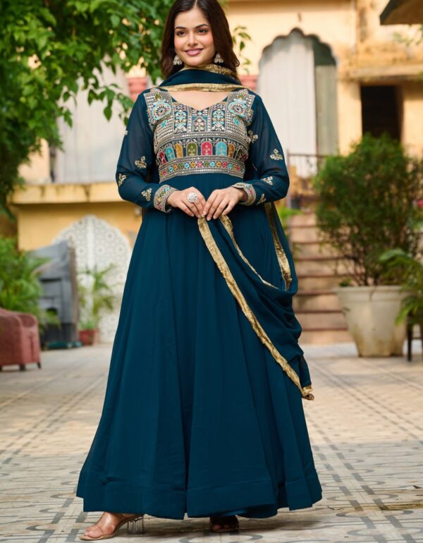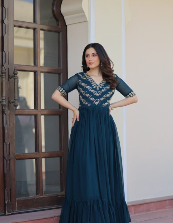 Model Height: 5.5 Model Is Wearing : M Size Gown :Fabric – Faux Blooming Work – Embroidery Zari Sequins-workFlair : 4.50mtrHeight – 40“Type