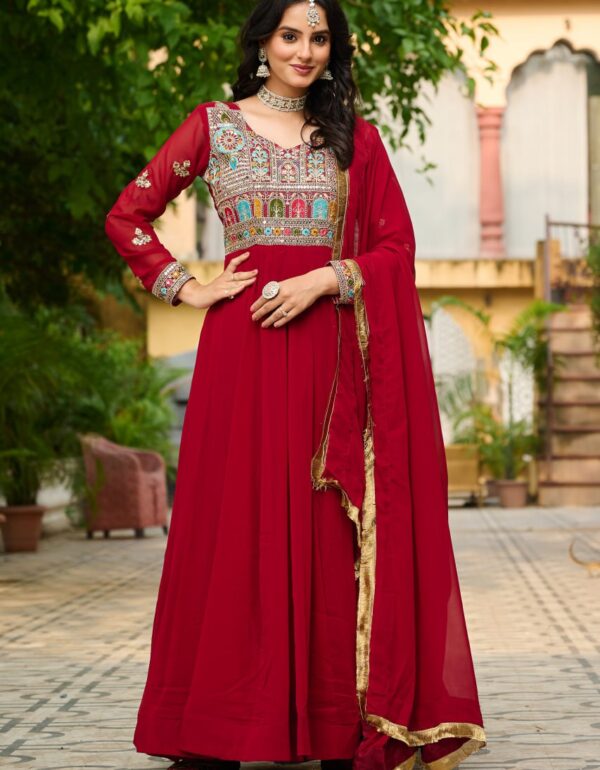 Model Height: 5.5 Model Height– M Size GownFabric:- Faux BloomingWork:- Sequins & Multi Thread Embroidered workInner:- Micro CottonFlair:- 4 mtr
