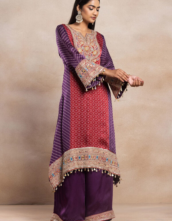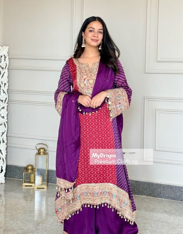 Regal Red & Purple Bandhani Ensemble With Palazzo & Dupatta