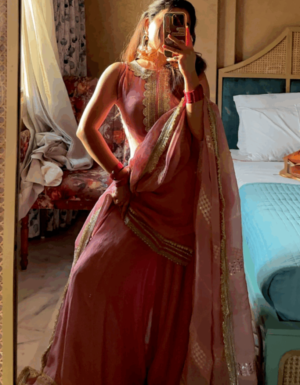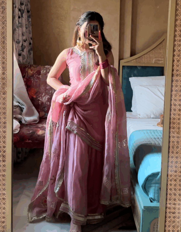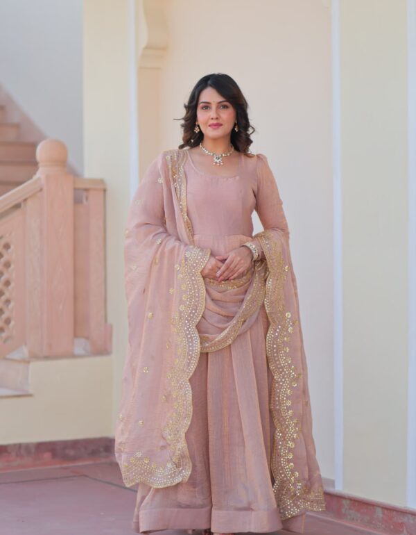 Model Height: 5.5 Model Is Wearing : M Size  Top :Fabric  –  Tabby OrganzaWork  –  Embroidery Sequence Work With Mirror WorkLength