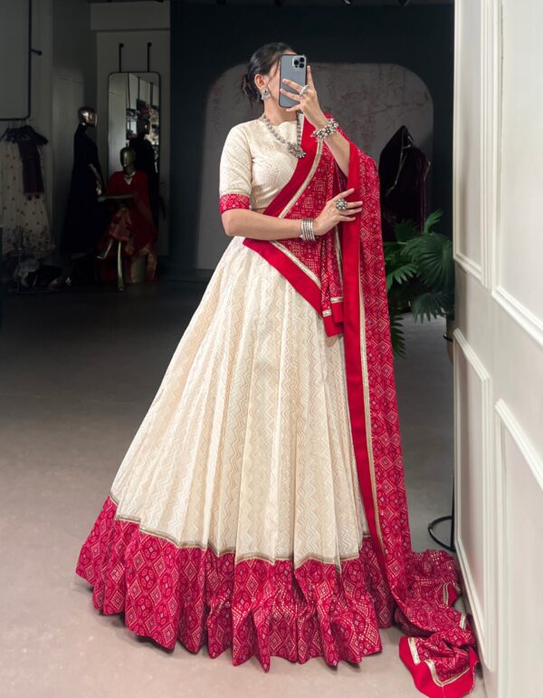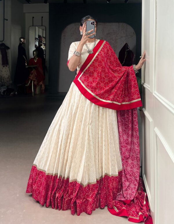 PRODUCT DETAILS : Lehenga (Stitched)Lehenga Fabric : CottonLehenga Work : Zigzag And Bandhej Print With Sequins Lace Touch UpLehenga Waist