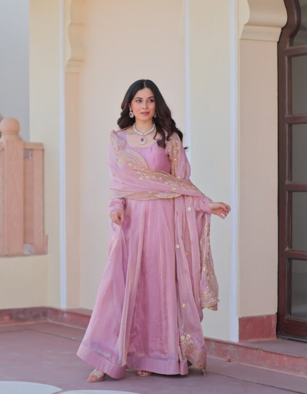 Product Detail : Gown:  Fabric: Tabby Organza Work: Embroidery Sequence Work With Fully Flair Sleeves: Full  Inner: Heavy Micro Cotton  Length: 49-