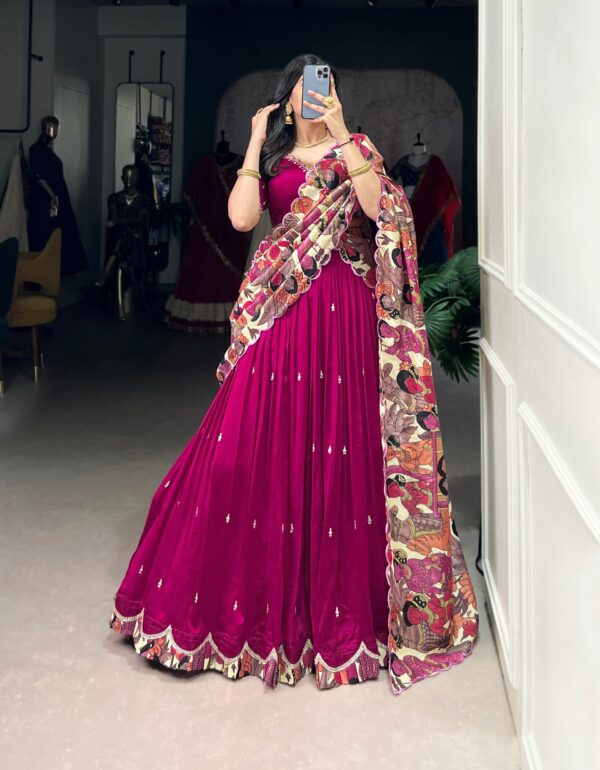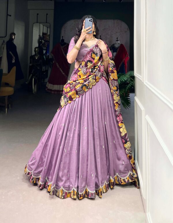 Product details : Lehenga (Stitched)Lehenga Fabric : Vichitra SilkLehenga Work : Sequins and Thread Embroidery Work With Kalamkari Print Border Lehenga