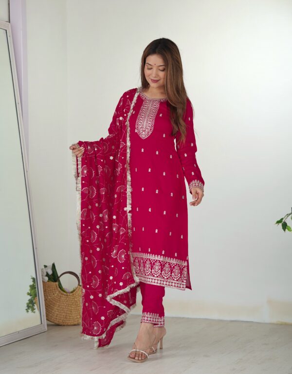 Top Fabric: Pure heavy viscose velvet with heavy embroidery, coding, and sequin work, featuring full embroidery sleeves.