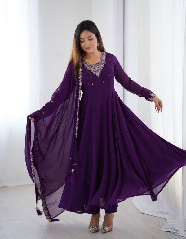 Model Height: 5.5 Model Height– M Size GownFabric – HEAVY PURE SOFT FOX GEORGETTEWork – FANCY EMBROIDERY BEADS AND JARI