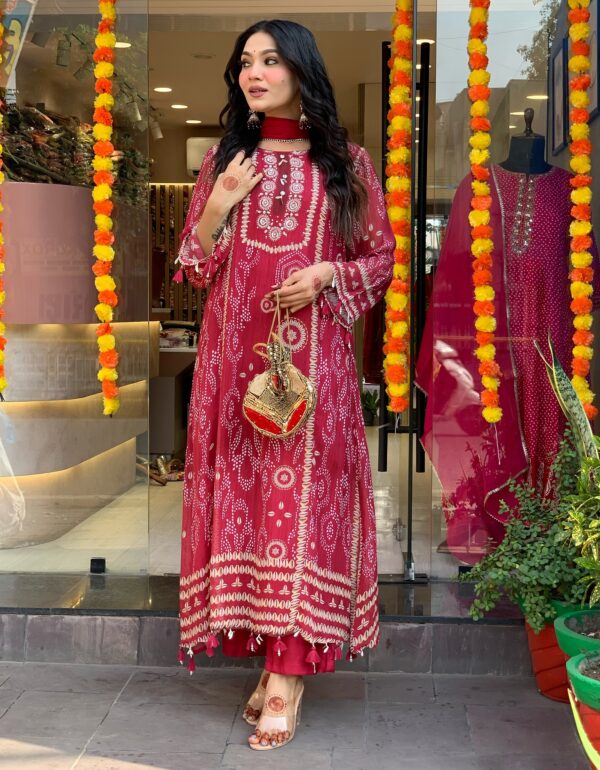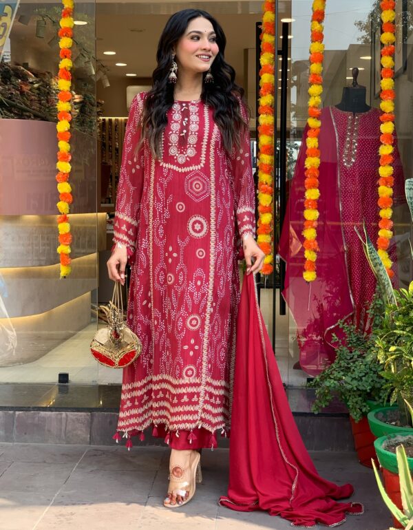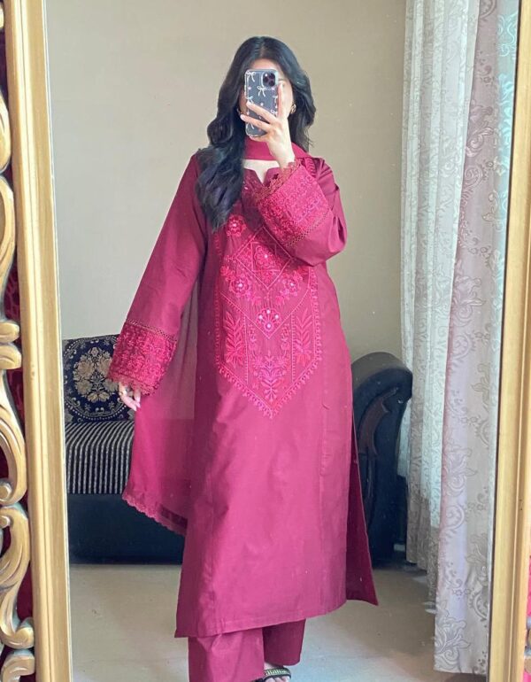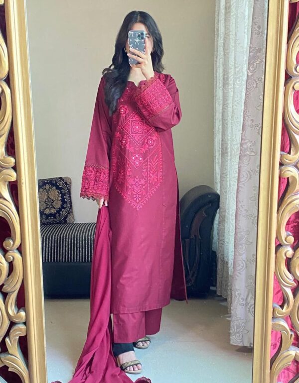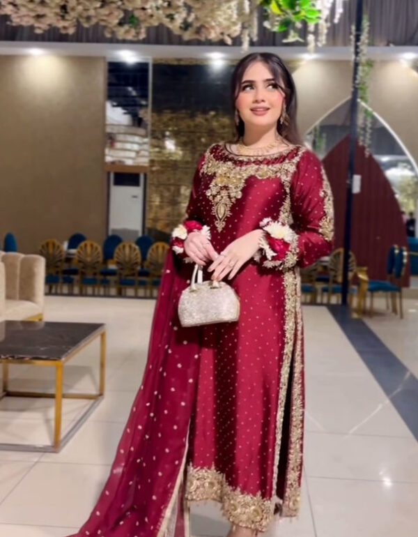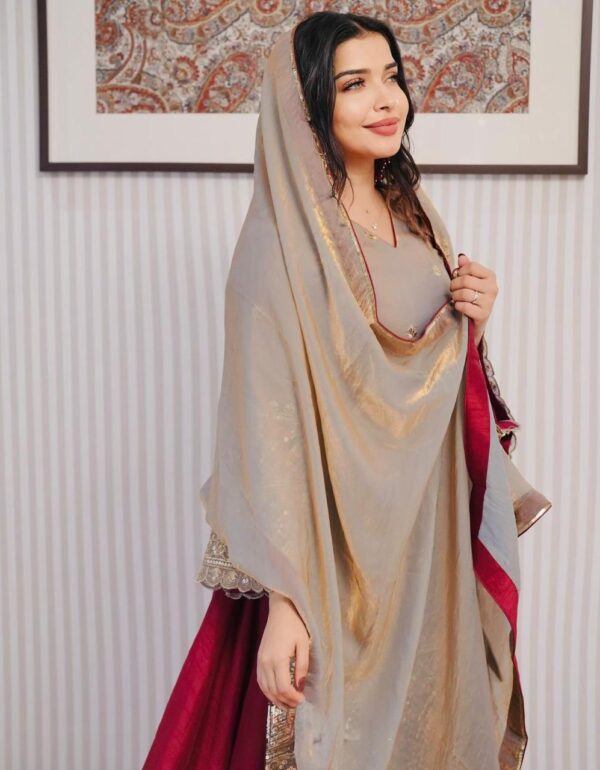 Fabric & Details: • Top Fabric: Roman Silk • Work: Embroidery with GPO lace on front and sleeves • Inner: Micro cotton ⸻ Pant Details: • Fabric: Roman Silk • Type: Fully Stitched, Free Size • Length: 39 inches ⸻ Dupatta: • Fabric: Georgette with GPO lace • Length: 2.2 meters