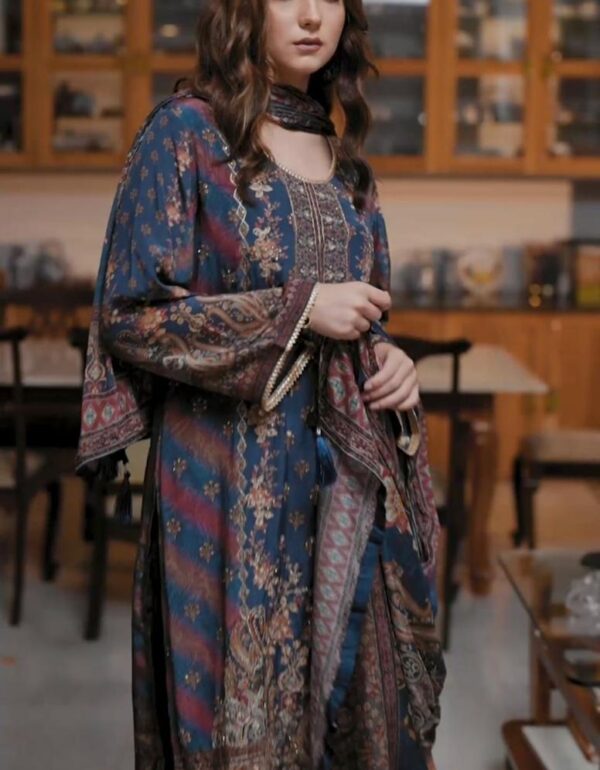 Suit: • Fabric: Premium chinnon • Inner: Micro • Work: Thread with sequins Pants: • Fabric: Soft Chinnon • Inner: Micro • Work: Thread with sequins Dupatta: • Fabric: Premium chinnon • Work: Thread with sequins • Size: 2.2 meters