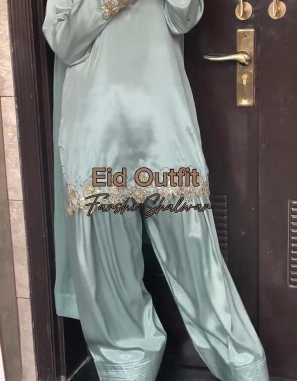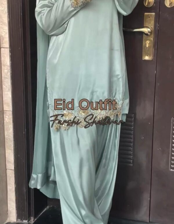 Sage Luxe Satin Farshi Ensemble with Artisan Embroidery