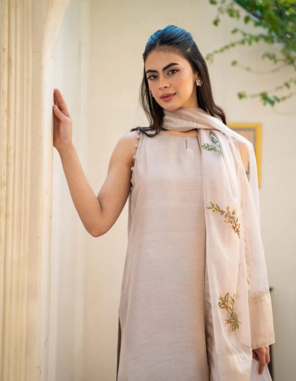 Kurta Adorn yourself in elegance with this breathtaking full-length kurta crafted from luxurious raw silk. The kurta features meticulously handcrafted buttons that add a refined artisanal touch, elevating the garment’s timeless appeal. Its smooth texture and rich sheen make it perfect for special occasions and sophisticated gatherings. Pant Complementing the kurta is a pair of tailored raw silk trousers, designed for comfort and style. The sleek silhouette enhances the overall grace of the ensemble while maintaining a contemporary edge. The pants balance the ornate detailing of the kurta and dupatta with understated sophistication. Dupatta The delicate hand-painted dupatta is a true masterpiece, featuring intricate embellished work on the top edge. This exquisite detail introduces a subtle whimsy, beautifully contrasting the sleek raw silk of the kurta and pants. Lightweight and fluid, the dupatta drapes effortlessly, completing the look with ethereal charm. Shipping Estimated delivery time: 3 to 8 business days. Each piece is carefully packed to ensure it arrives in pristine condition. Care Instructions To maintain the richness and longevity of your ensemble, we recommend dry cleaning only. Handle with care to preserve the delicate hand-painted and embellished details. Note on Color Variation Please note that due to the handcrafted nature of the fabric and embellishments, slight color variations may occur. These subtle differences add to the unique charm and authenticity of your garment.