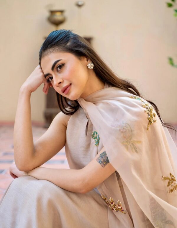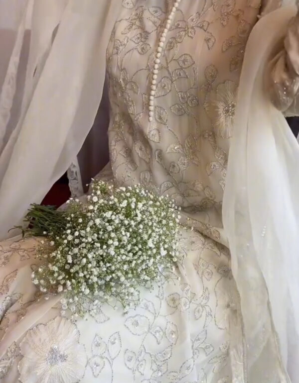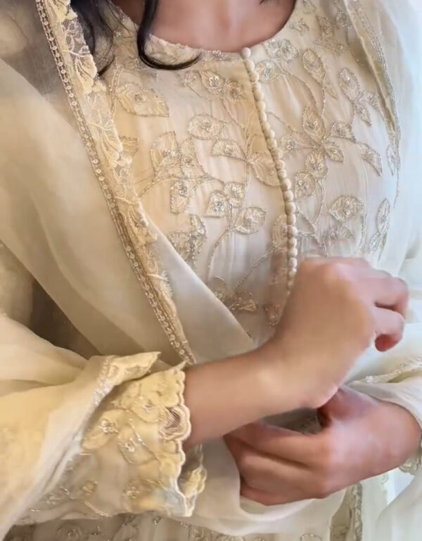Kurta: A vision of grace, this long ivory kurta is meticulously crafted from a luxurious embroidered fabric, adorned with delicate floral threadwork and light sequin detailing. The elegant silhouette and soft structure make it ideal for formal daytime occasions or intimate celebrations. Pant: Matching ivory-toned straight pants provide a clean, graceful base that complements the intricate embroidery of the kurta while ensuring comfort and ease of movement. Dupatta: A soft, sheer organza dupatta drapes effortlessly, adding a touch of ethereal charm. Finished with subtle detailing along the edges, it completes the ensemble with lightness and poise. Shipping Info: Delivery within 4 to 8 working days. Care: • Dry clean only • Handle with care to maintain embroidery