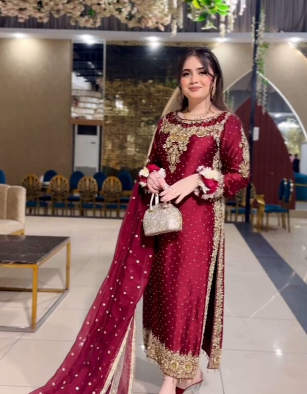 ' Fabric Details Top • Top Fabric: Premium Chinnon Silk with Heavy Embroidery Sequence Work and Full Sleeves with Revet Moti • Top Inner: Heavy Micro Cotton • Top Length: 47-48 inches • Fully Stitched Ready to Wear Pant • Pant Fabric: Premium Chinnon Silk with Heavy Embroidery Sequence Work and Elastic • Pant Length: 40-41 inches • Fully Stitched Dupatta • Dupatta Fabric: Butterfly Net with Embroidery Sequence Work and Lace Border Additional Information • Customization Available (Contact for details). • Note: Slight color differences may occur due to lighting, photography, or screen resolution. Care Instructions • Dry Clean Only Shipping Information • Delivered in 3 to 5 Days